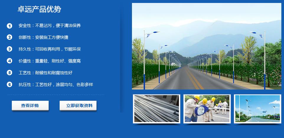 江蘇卓遠(yuǎn)照明科技有限公司坐落于中國(guó)路燈之鄉(xiāng)——風(fēng)景秀麗的揚(yáng)州市郭集工業(yè)區(qū),是集LED燈具、太陽(yáng) 能路燈等產(chǎn)品的研發(fā)、制造、銷售、安裝服務(wù)于一體的現(xiàn)代化企業(yè)。主要生產(chǎn)LED燈具、太陽(yáng)能路燈、錐形變徑燈桿、中高桿燈、景觀燈、庭院燈、交通信號(hào)燈及 景觀護(hù)欄等八大系列產(chǎn)品,產(chǎn)品暢銷國(guó)內(nèi)各省區(qū),銷售網(wǎng)絡(luò)遍布各省區(qū)。